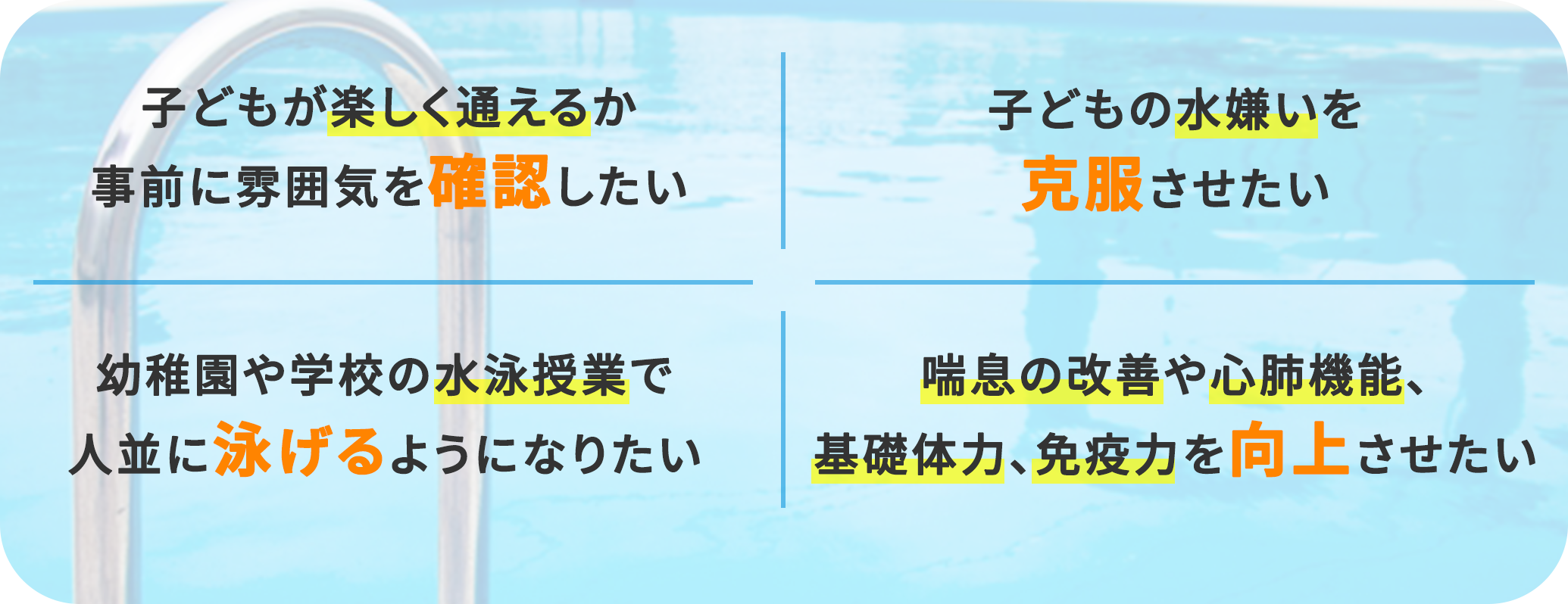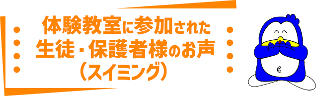 もともと喘息があった息子が水泳を習い始めてから夜中に咳き込むことが激減し、風邪もひきにくくなったように感じます。今年から回数も増やしたのでたくさん練習してたくましく育ってほしいです。